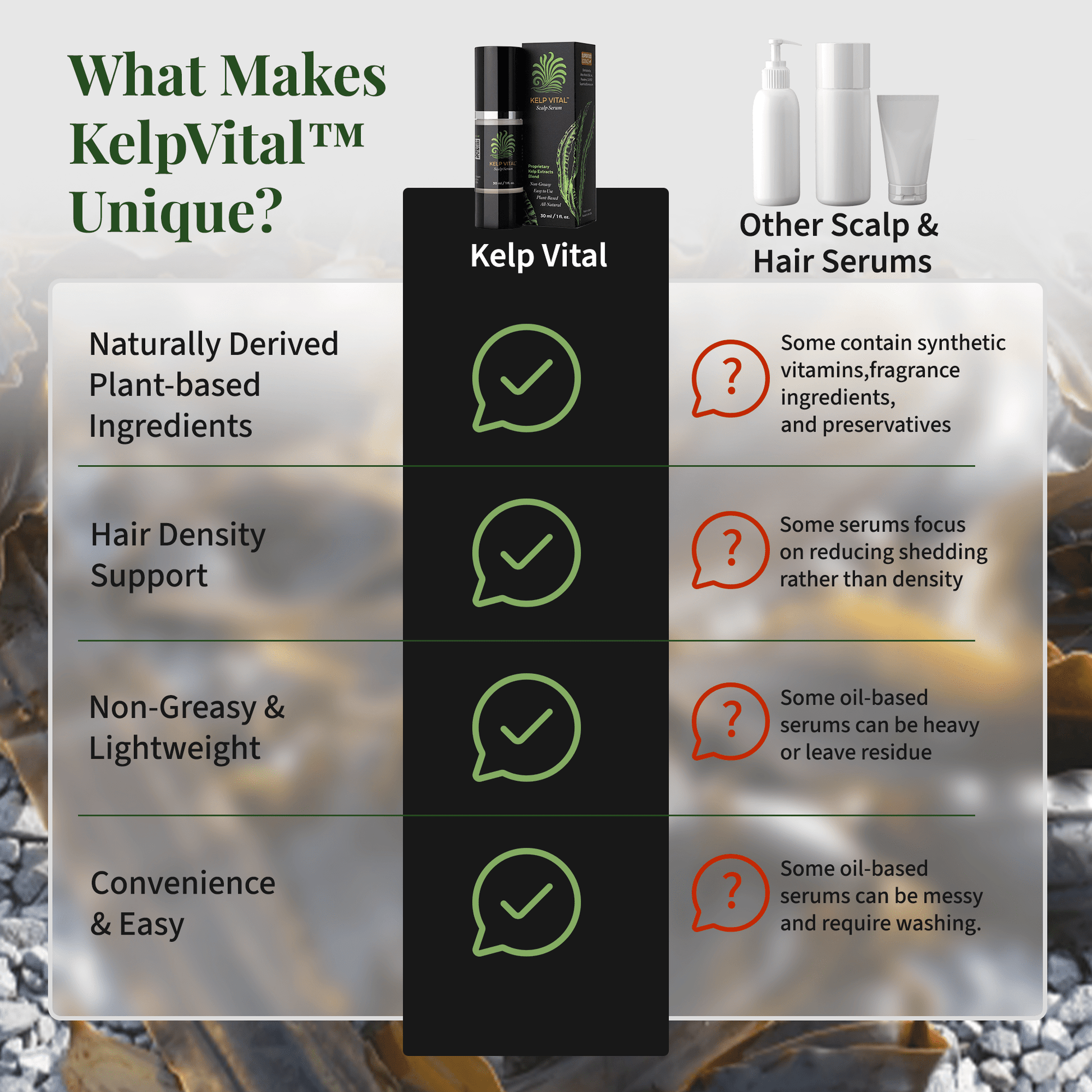 It’s gentle enough for daily use, yet effective enough to help reduce the visible signs of thinning hair and dryness. Whether you're seeking a scalp serum for dry scalp, a hair growth serum for thinning hair, or simply a nourishing scalp treatment to upgrade your routine, Kelp Vital delivers the hydration, balance, and support your scalp needs—all without harsh chemicals or buildup.
